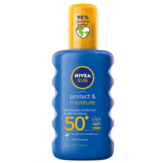 Nivea Sun Protect & Moisture Sun Spray combines Nivea Sun’s advanced sun protection expertise with all the care of Nivea for soft, protected skin. With highly effective UVA and UVB filters, this water resistant sun lotion provides immediate protection from UV rays as well as long lasting moisturisation in the convenience of an easily absorbed spray.